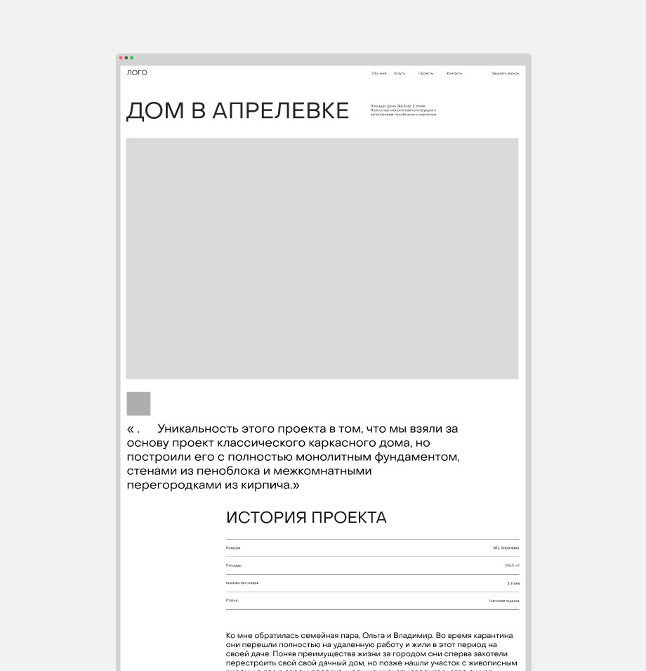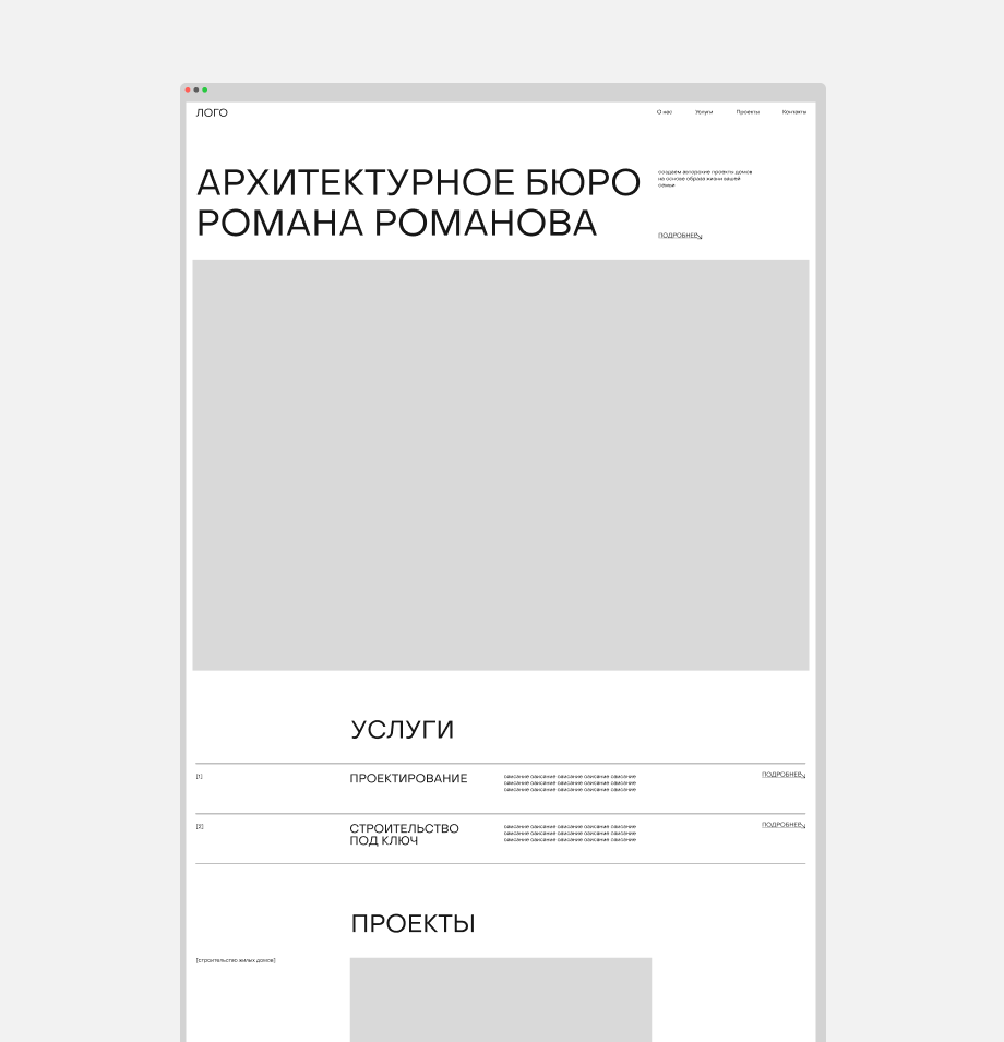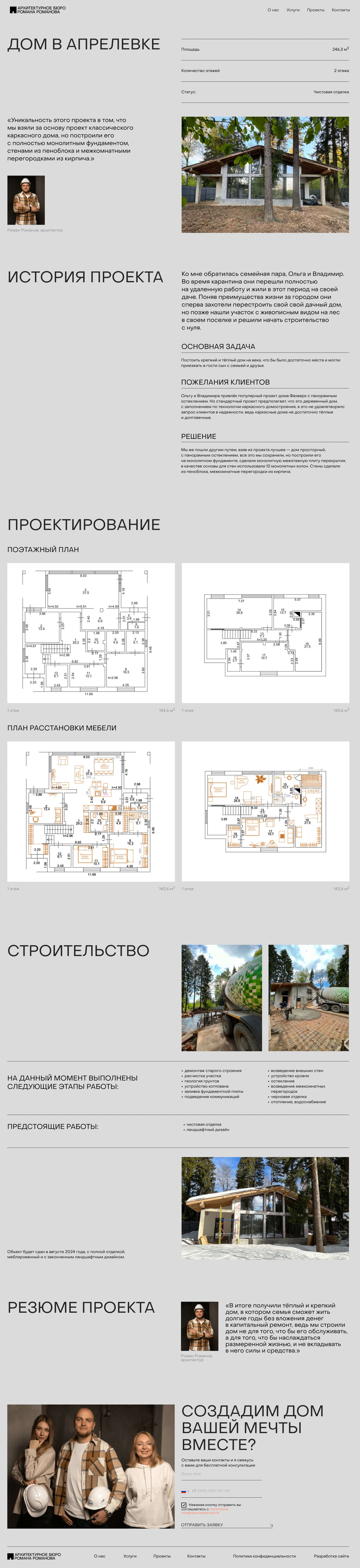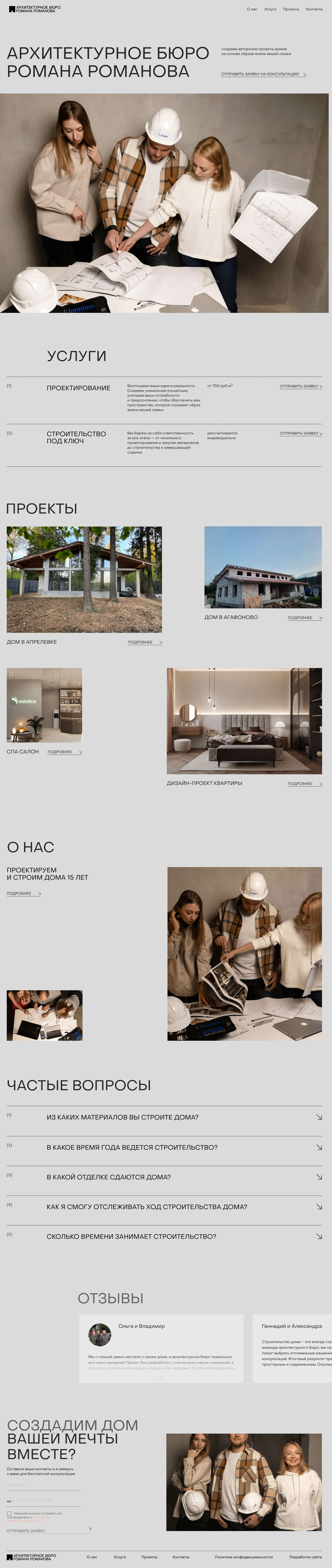 Роман обратился ко мне за разработкой сайта, который будет представлять услуги его бюро и портфолио работ. Ранее у бюро не было сайта, что ограничивало их возможности по привлечению новых клиентов и демонстрации своих проектов. Создание современного и функционального сайта стало необходимостью для того, чтобы продемонстрировать уникальный стиль и подход компании, а также облегчить процесс взаимодействия с потенциальными клиентами.
