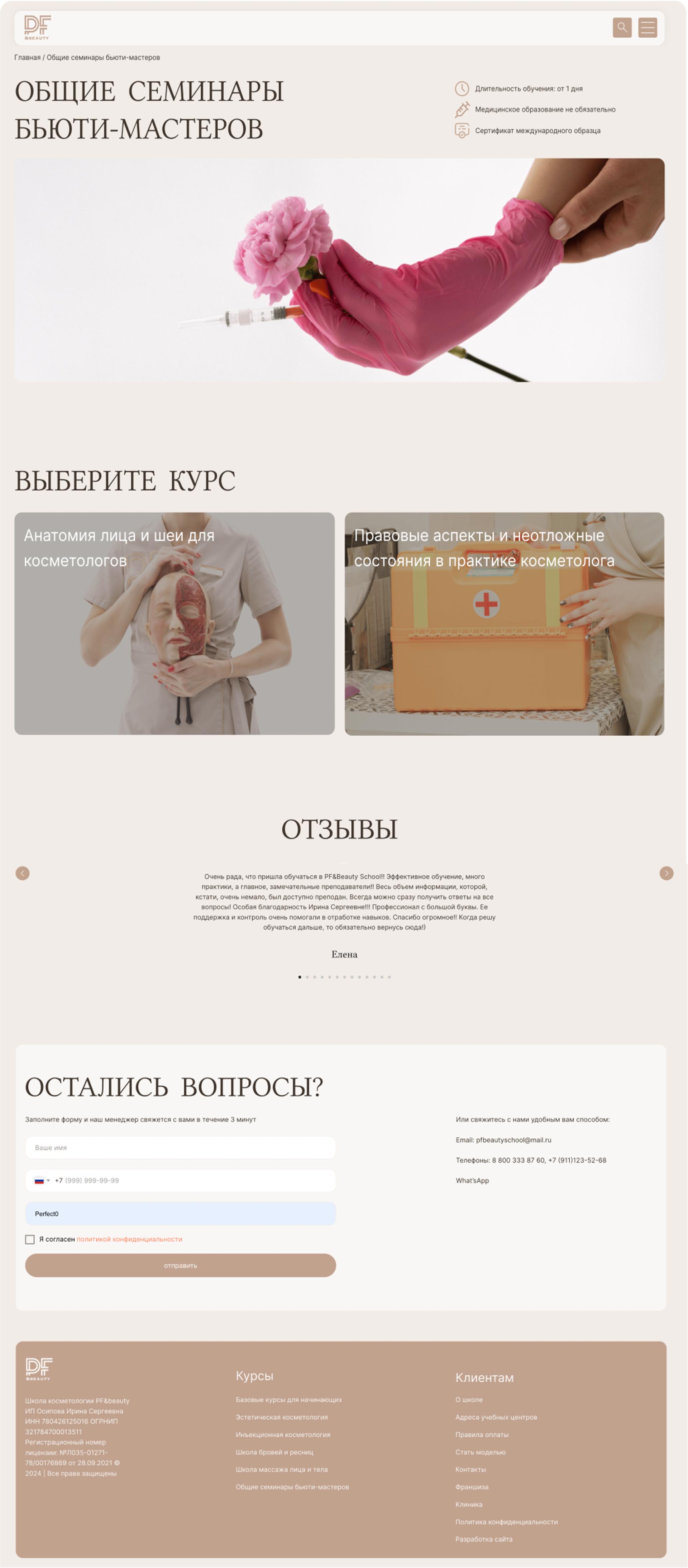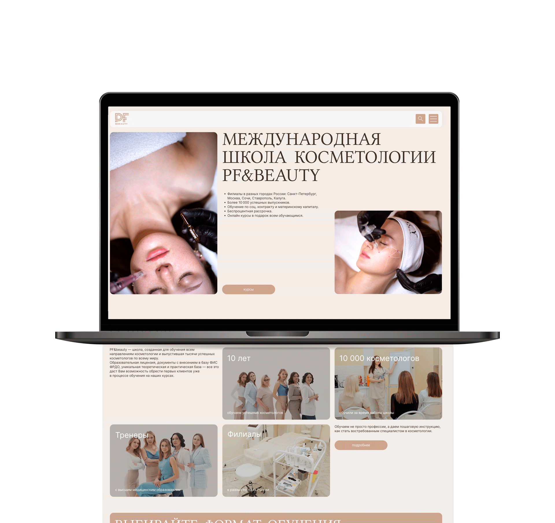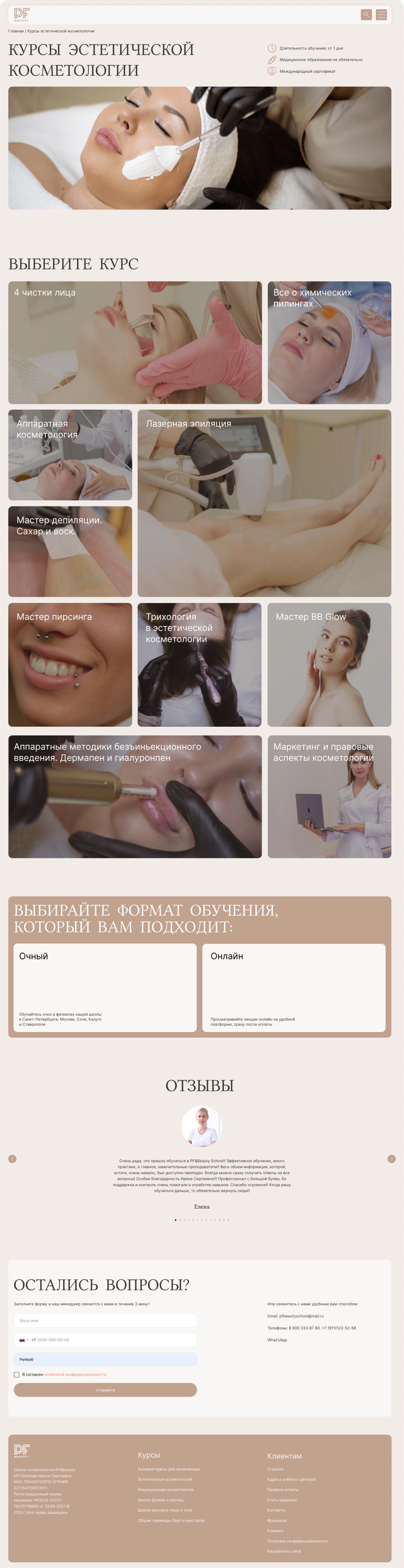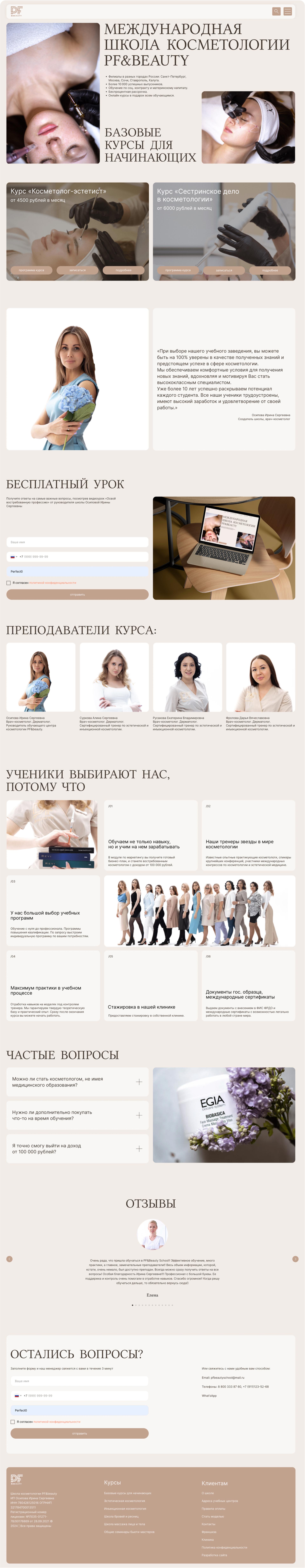 PF&beauty — школа, созданная для обучения всем направлениям косметологии и выпустившая тысячи успешных косметологов по всему миру. Проводят обучение обучение оффлайн в своих Филиалы в разных городах России: Санкт-Петербург, Москва, Сочи, Ставрополь, Калуга, и онлайн по всему миру.