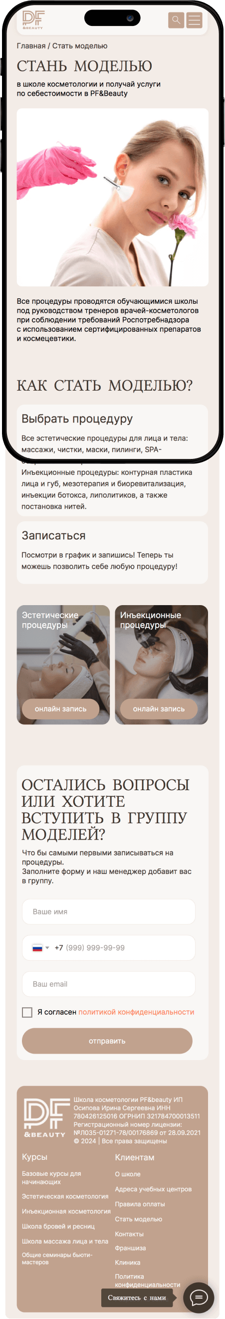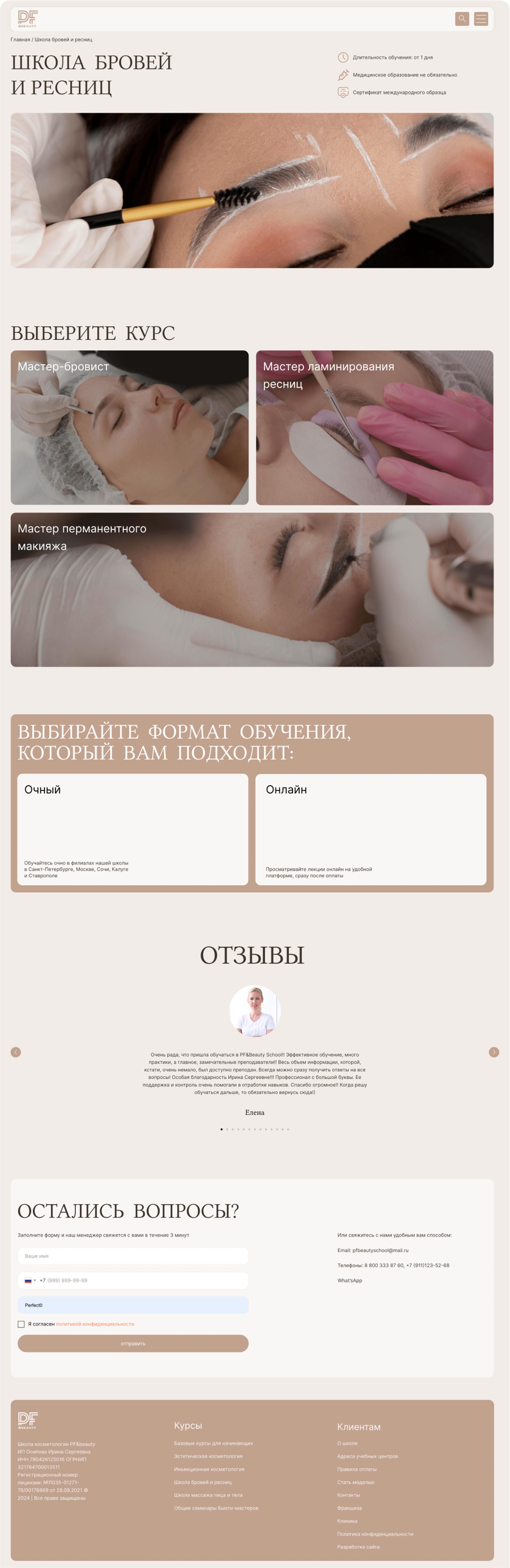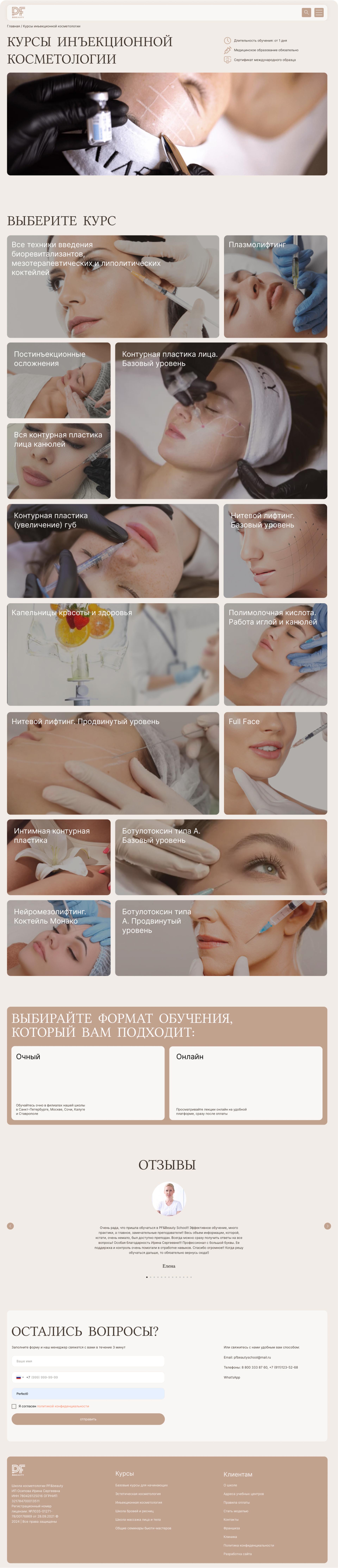 PF&beauty — школа, созданная для обучения всем направлениям косметологии и выпустившая тысячи успешных косметологов по всему миру. Проводят обучение обучение оффлайн в своих Филиалы в разных городах России: Санкт-Петербург, Москва, Сочи, Ставрополь, Калуга, и онлайн по всему миру.