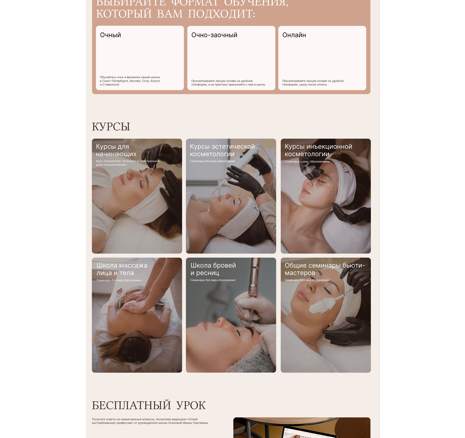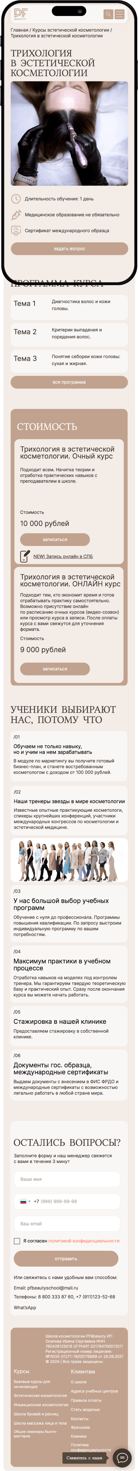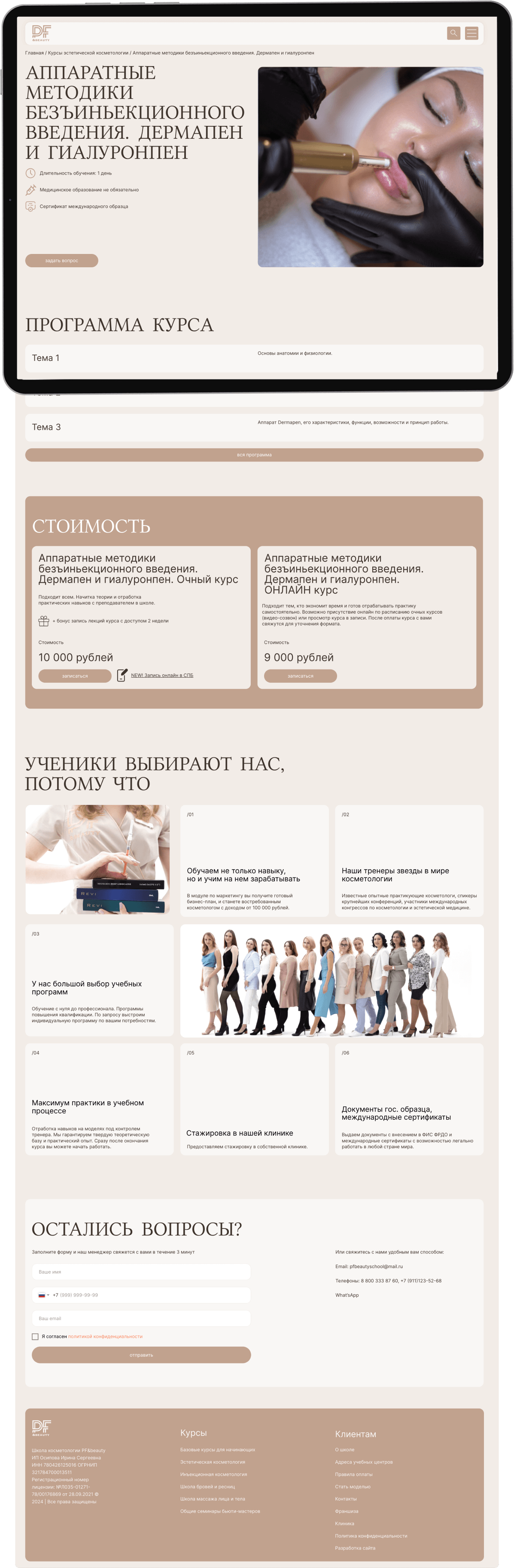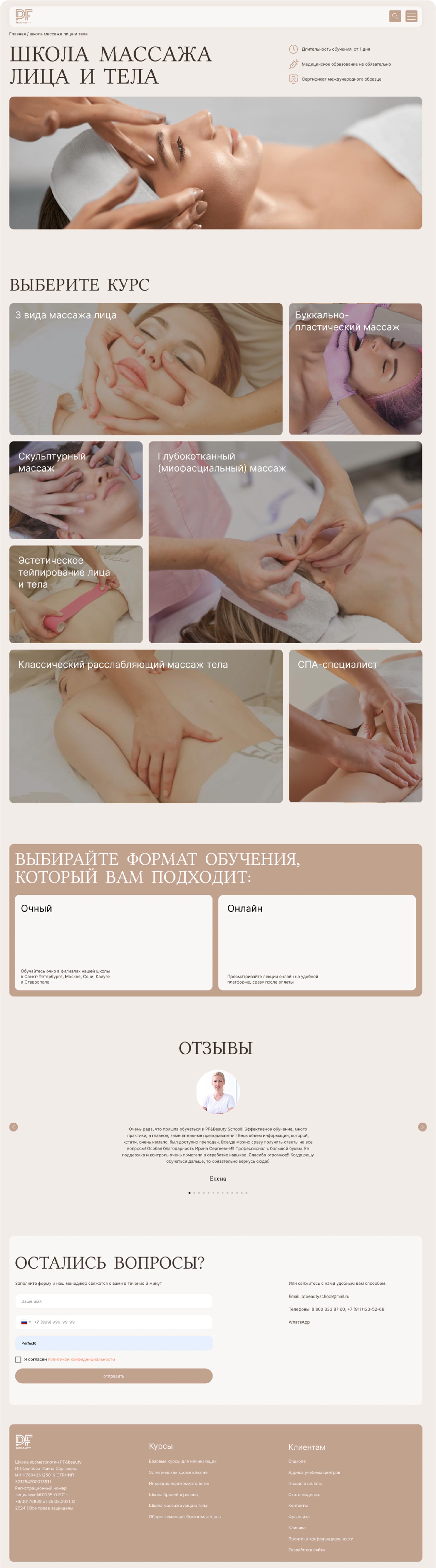 PF&beauty — школа, созданная для обучения всем направлениям косметологии и выпустившая тысячи успешных косметологов по всему миру. Проводят обучение обучение оффлайн в своих Филиалы в разных городах России: Санкт-Петербург, Москва, Сочи, Ставрополь, Калуга, и онлайн по всему миру.
