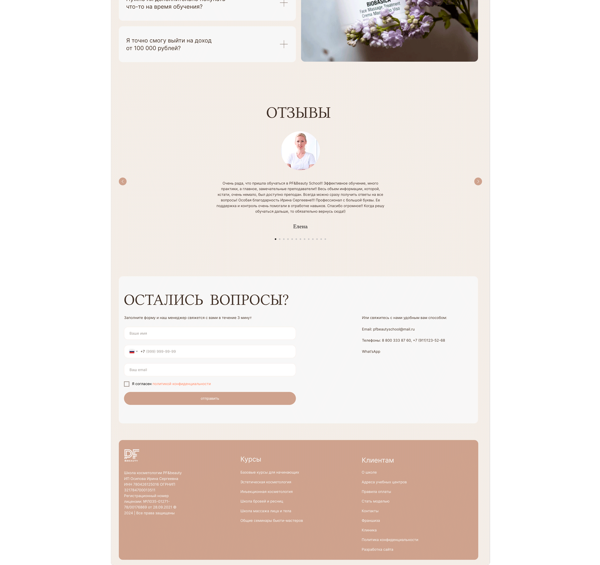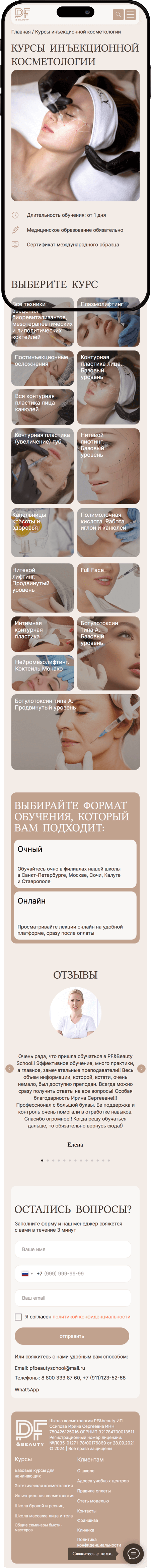 >>>>>>>>>>>>>>>>PF&beauty — школа, созданная для обучения всем направлениям косметологии и выпустившая тысячи успешных косметологов по всему миру. Проводят обучение обучение оффлайн в своих Филиалы в разных городах России: Санкт-Петербург, Москва, Сочи, Ставрополь, Калуга, и онлайн по всему миру.